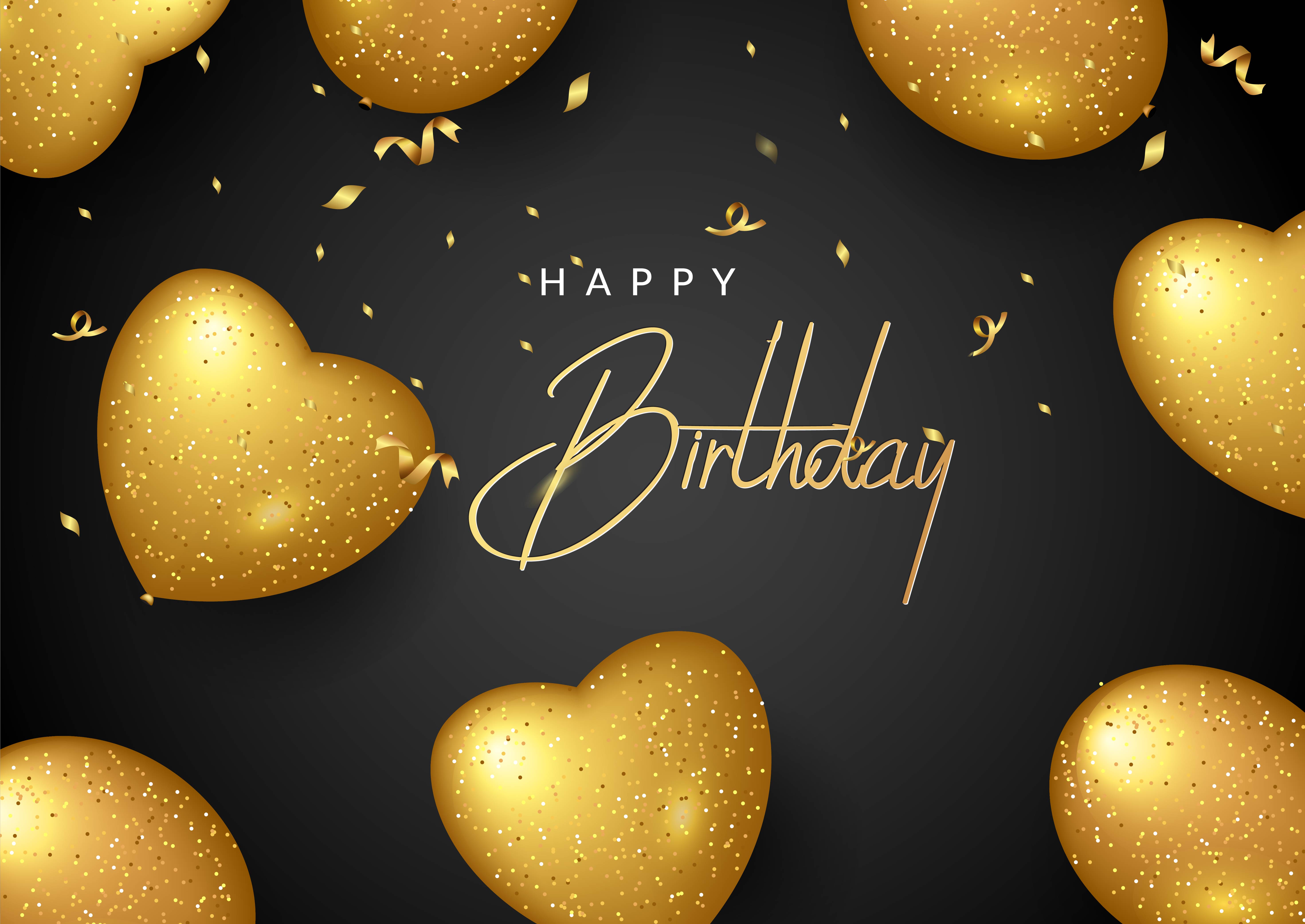 Happy Birthday elegant greeting card with gold balloons and falling